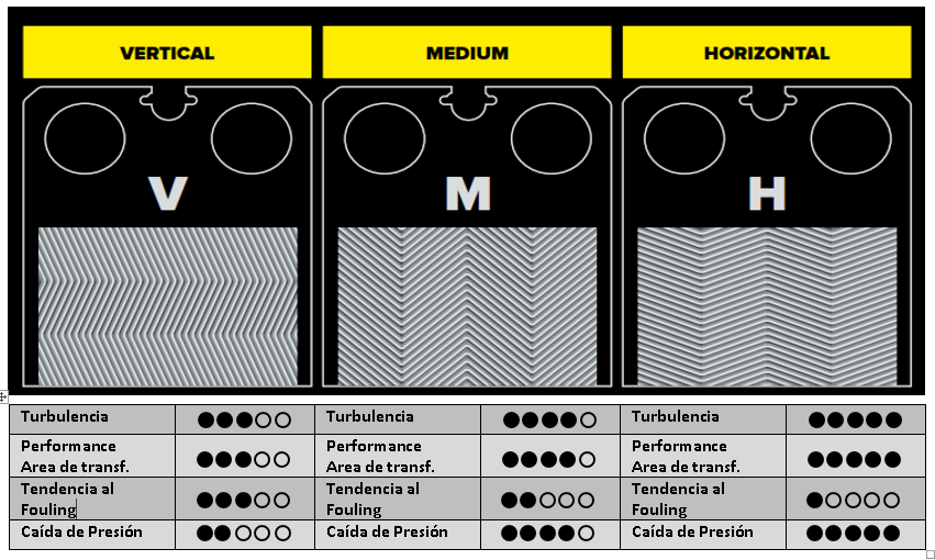 KELVION ofrece hasta 3 tipos de la corrugación estándar y muy conocida como espina de pez ó corrugación Chevron. La combinación de éstos también es posible para lograr el punto de operación óptimo para su requerimiento.