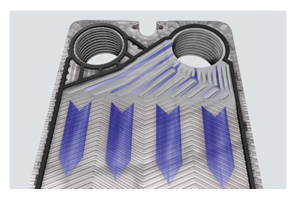 El canal de flujo formado por las placas corrugadas, como en nuestros intercambiadores Kelvion, crean un flujo turbulento al interior. A más turbulencia, mayor transferencia de calor y por lo tanto menor área de transferencia requerida. Un flujo turbulento también reduce la tendencia a la formación de fouling por el efecto de autolimpieza que se genera al interior.